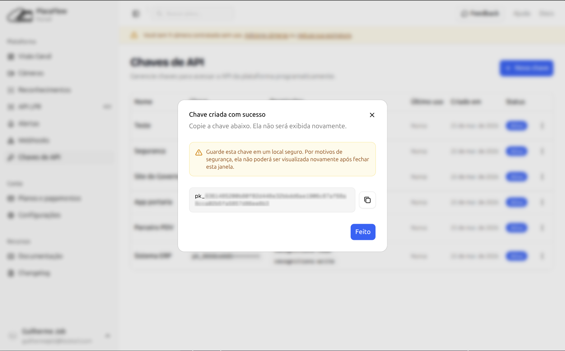 Na tabela de chaves, cada chave exibe um prefixo (ex: pk_a1b2c3d4••••••••) para que você possa identificá-la sem expor o valor completo.