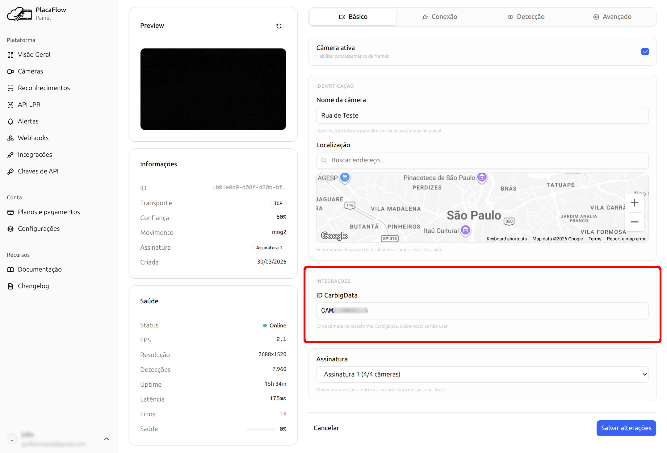 - Na seção Integrações (no final da página), preencha o campo ID CarbigData com o código da câmera na CarbigData
