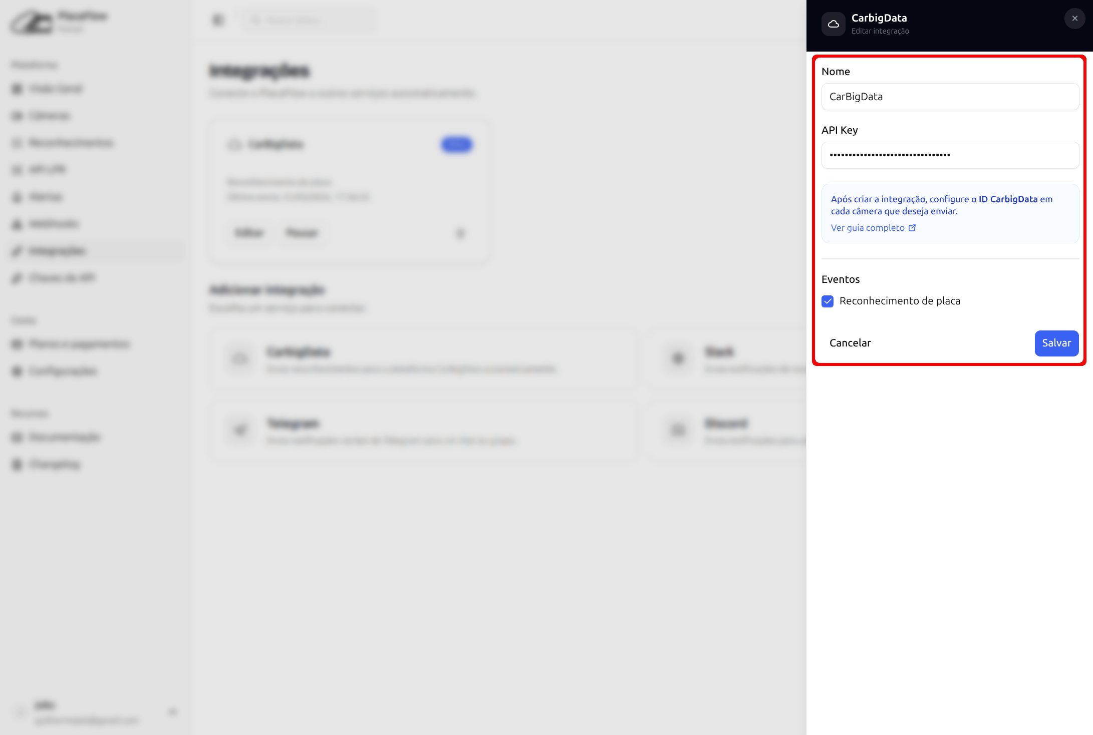 A integração com CarbigData permite enviar reconhecimentos de placas automaticamente do PlacaFlow para a plataforma CarbigData, incluindo foto e dados da captura.