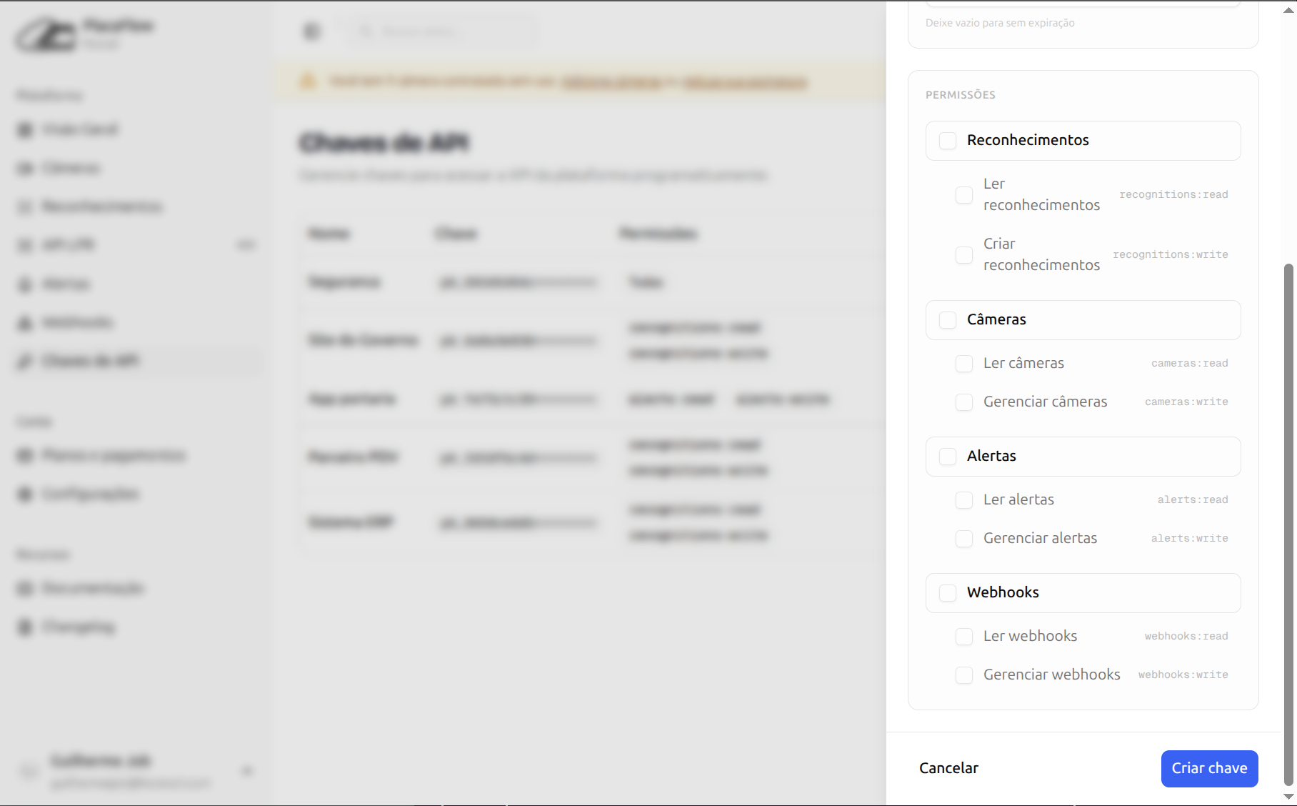 | Câmeras | cameras:read — Listar câmeras | cameras:write — Criar, editar, excluir |