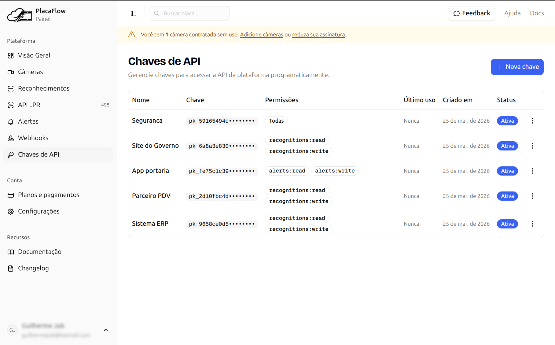 Na tabela de chaves, cada chave exibe um prefixo (ex: pk_a1b2c3d4••••••••) para que você possa identificá-la sem expor o valor completo.
